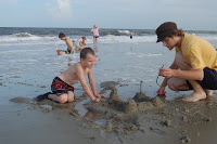 What a beautiful place! It is very warm (hot) but the ocean breeze is cooling. And, ahh, the ocean! Majesty, power, and beauty! This was the first time our two youngest had experienced the ocean- they were more interested in the swimming pool until we dragged them to the beach and then suddenly they were enthralled! “Wow, look at the sand!” “I found a shell, and another, and another!” “Can I jump the waves?” “Do we have to leave?” And Adam’s favorite line for anywhere that he particularly likes: “I wish we could live here!” I was pleased that the water was so warm- not cold like the Pacific Ocean. The kids had fun body surfing in the waves, at least until a wave tumbled Dustin against the abrasive sand (he has the battle scars) and then the coast guard came along warning of rip tides forming.